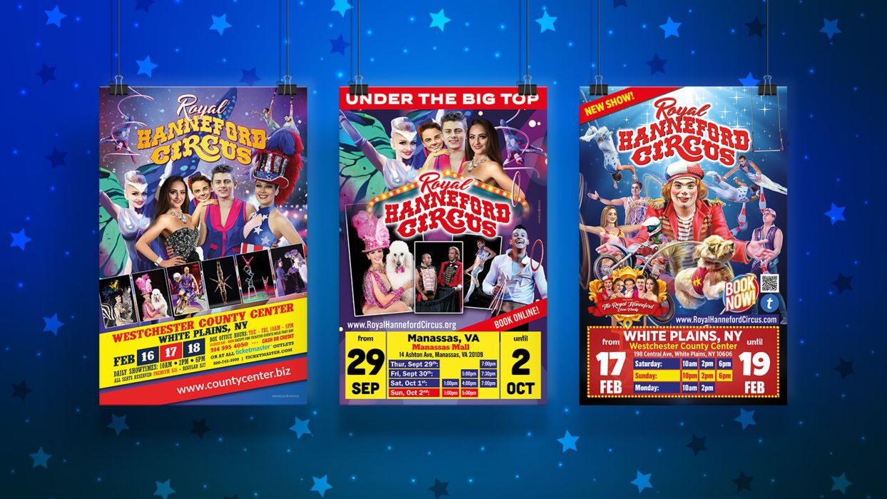 We were very happy when we received a request a few years ago to design a poster for the current show. Initially, numerous photos of artists and animals were used, but the design was soon switched to digital drawings. Over the last few years, many more products have been created for print and online and templates have been designed for the design of the circus, such as the ticket booth.