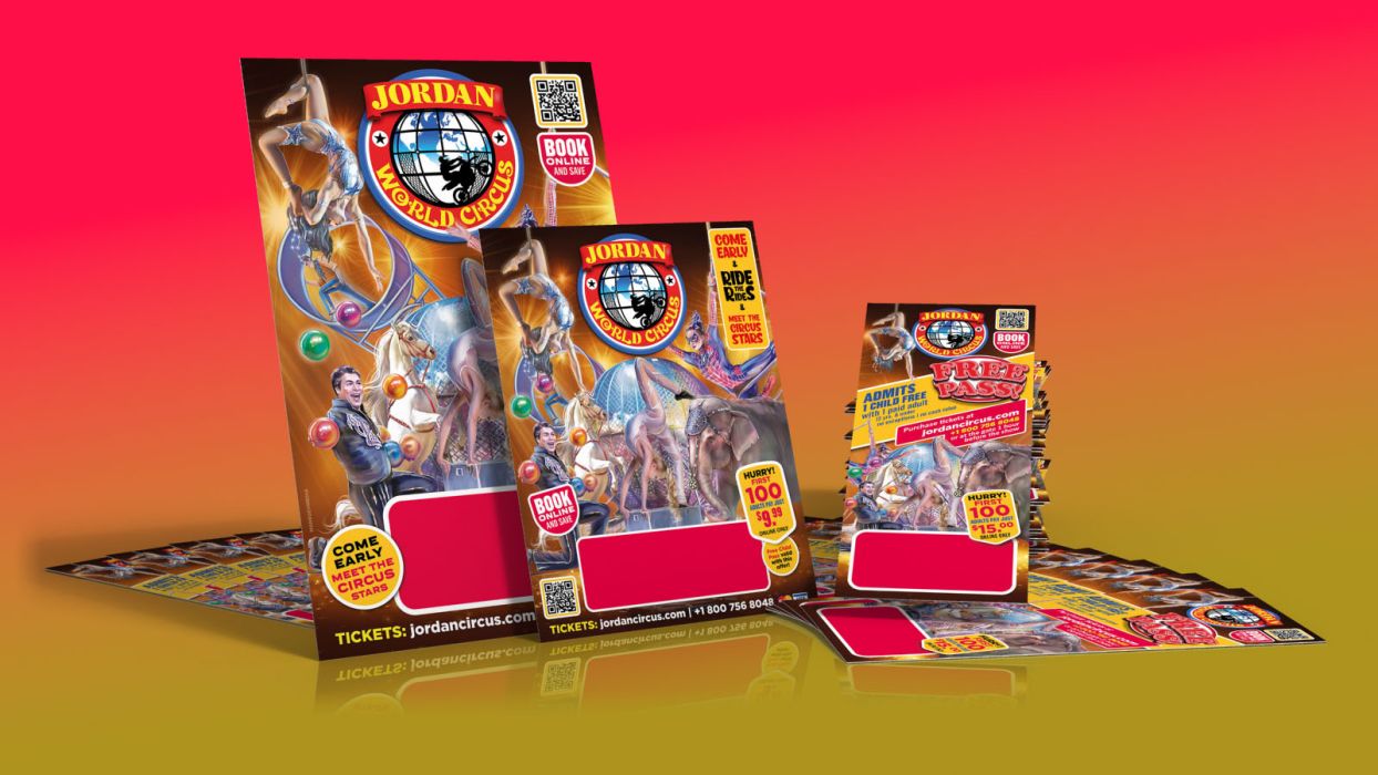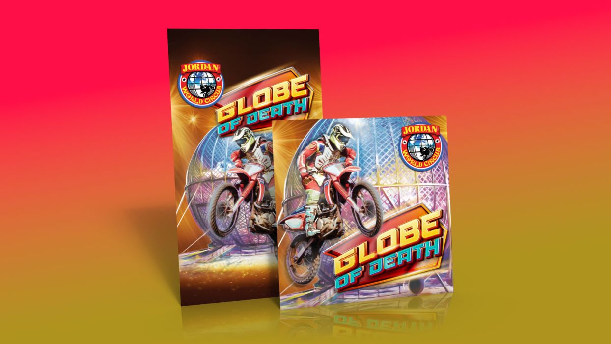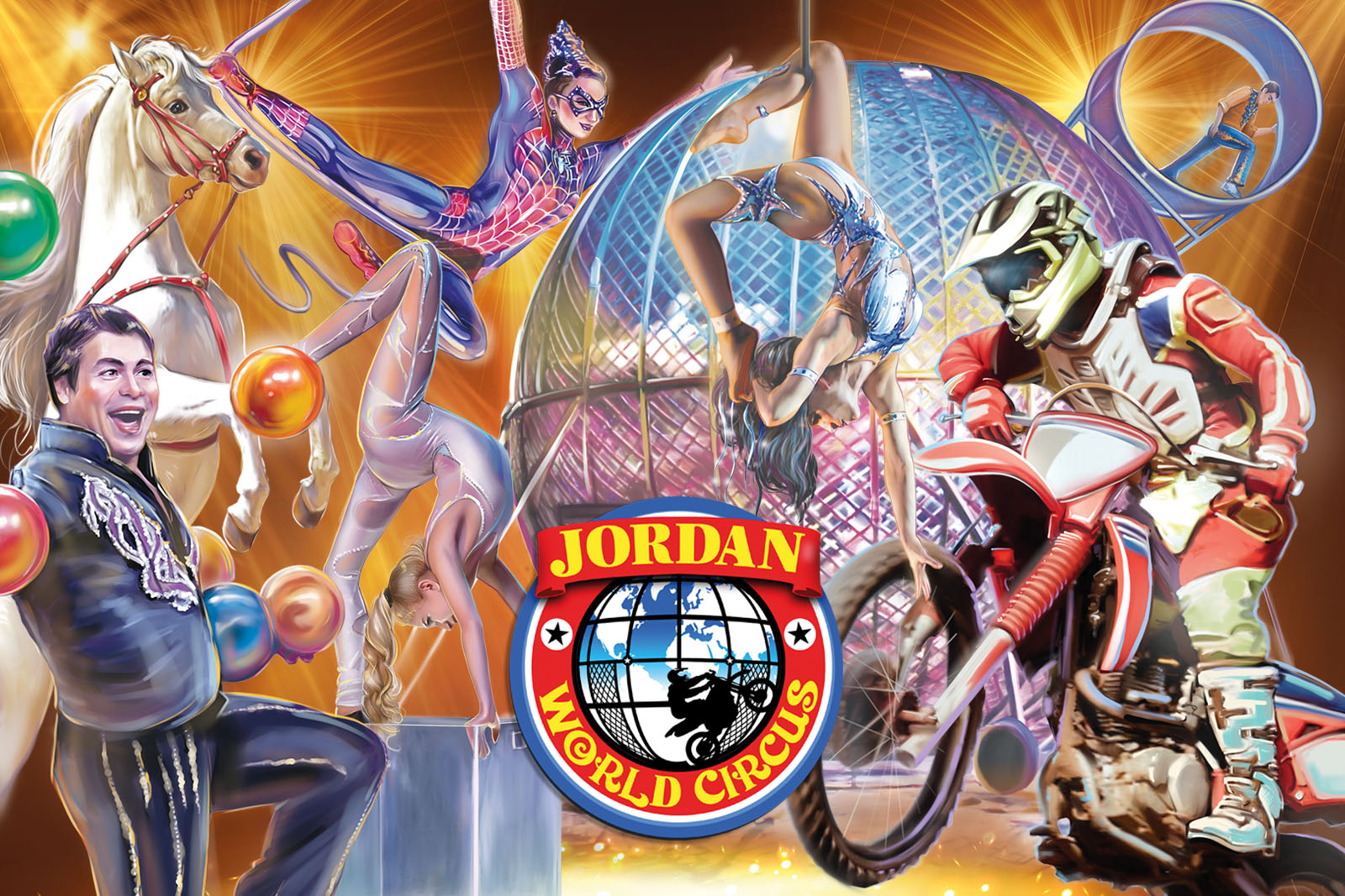 The advertising material for the action-packed Jordan World Circus was implemented with a comic-like motif. Numerous, exciting acts with motorcycles and aerial and ground artists were presented on the poster, some in combination with elephants.